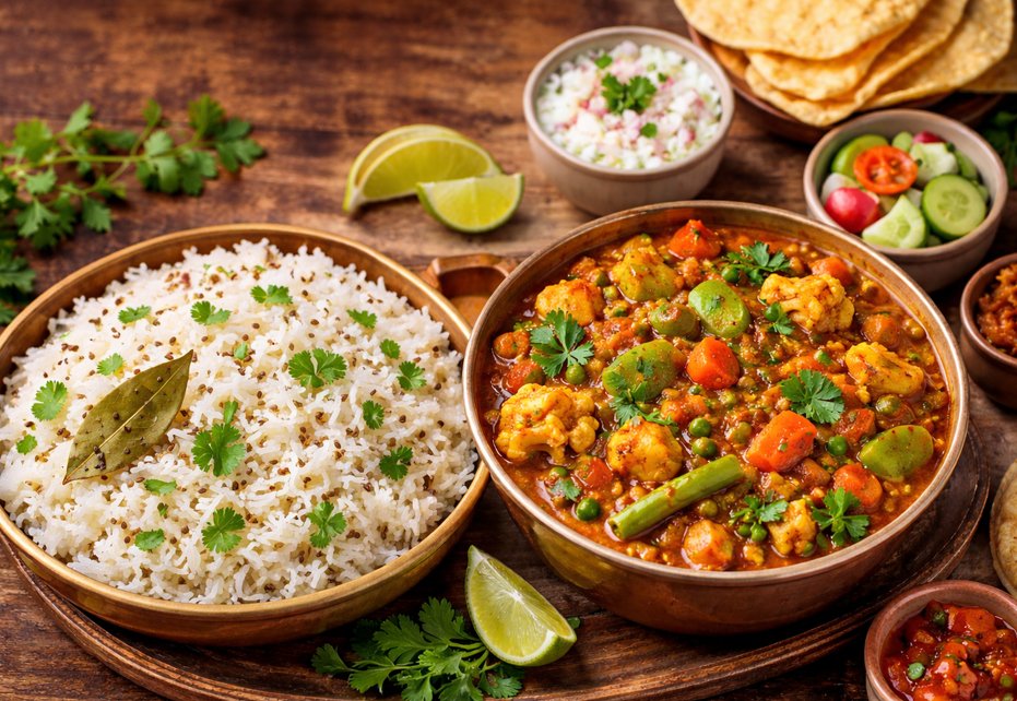 Jeera Rice is a fragrant basmati rice dish tempered with cumin seeds (jeera), ghee, and whole spices. It pairs beautifully with Veg Curry, a mixed vegetable gravy cooked in onion-tomato masala with Indian spices.